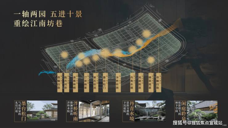 园林设计上依据“一轴两园五进十景”规划,以豫园造景手法为基础,提取楼阁、折桥、墨池等中式元素,构建立体山水,重绘江南坊巷。