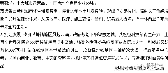 【医疗配套】:项目东侧自身配套杭州师范大学附属新湾街道社区服务中心;距项目约5公里左右为杭州市一医院大江东院区(即将升级为3级甲等医院)
