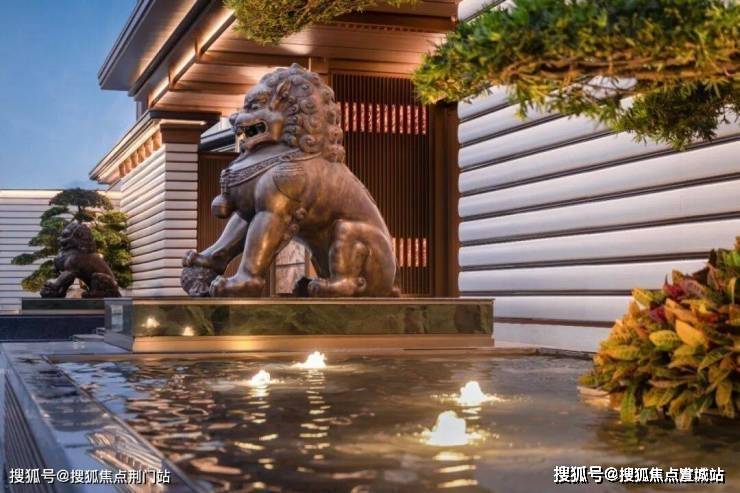 屋檐取形太和殿庑殿顶,两侧铜狮镇守、五步青云阶递进,涌泉灵动,琮黄色调沉稳铺陈。这不仅是归家的仪式,更是家族门风的当代写照,从第一眼即奠定东方礼序与不凡气场。