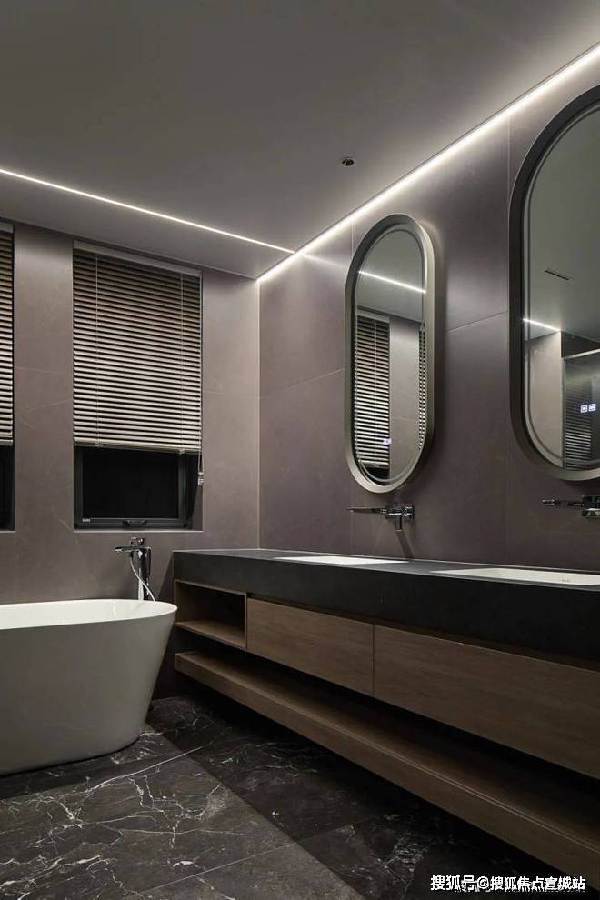 主卫不动声色地延续着整个意式空间的低奢内敛品质,大面积使用黑白纹理的【爱力蒙特∙黑金帝国石】铺装,石材质感独特,纹理自然流畅,形成强烈视觉冲击,整体空间简约大气.双台盆的设计,干湿分区布局,为居住者的生活使用带来便利.