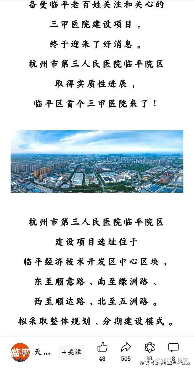 距离项目直线约1公里是临平区首个三甲医院(杭州市第三人民医院),项目计划2025年开工建设,皮肤科是市三医院的“金字招牌”,作为国家临床重点专科、浙江省医学重点学科,位列全国前三!此外临平还有浙大二院也官宣正式签约!