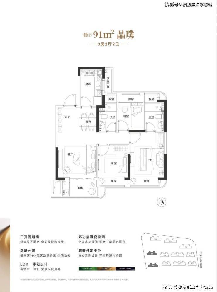 「奉发·右岸晶邸」售楼处电话:400-8618-004✨✨建面约91㎡做3房2卫,三开间朝南、3房5飘窗1阳台,整体室内的采光、视野以及通风都相当出彩。动静分离+主卧套房的设计,保证了整体居住的安静和私密性。