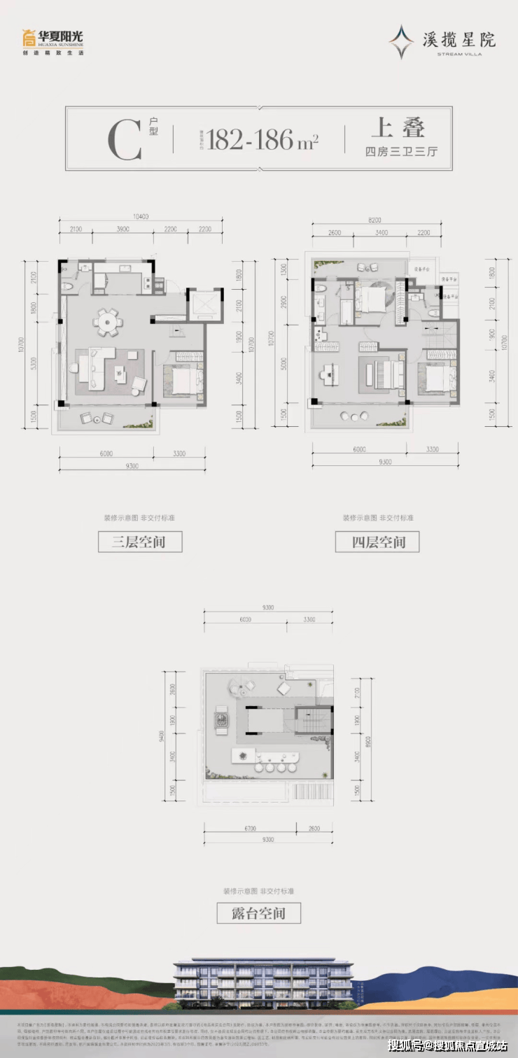 建面约182~186㎡上叠:约6m顶层观景阳台/餐客厅、书房开放设计/套房式主卧