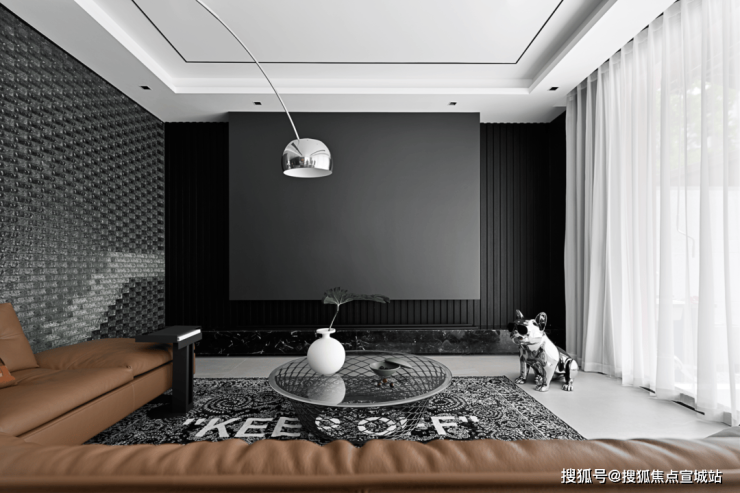 空间是光影的容器,自然光穿透白色的纱帘给会客厅加了一层摩登的滤镜。两侧纱帘光影通透,暗香浮动,几丝波影乍如烟。一处吧台,临烟火,酌清欢。烟火清欢,一半一半。