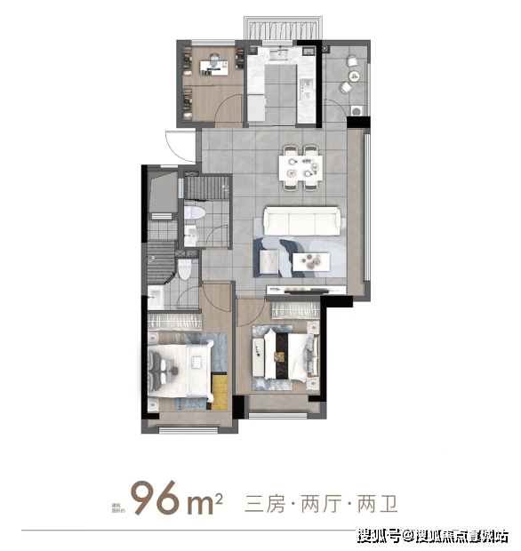 「建面约96㎡3房2厅2卫」