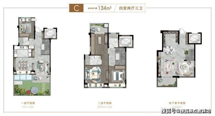 约134平下叠4房户型,紧邻贝港河畔,纯美水岸筑造诗意栖居,全房共有2层并附赠全明地下室,地上首层为生活区,设计南向绿化空间,做到真正的有天有地有花园!