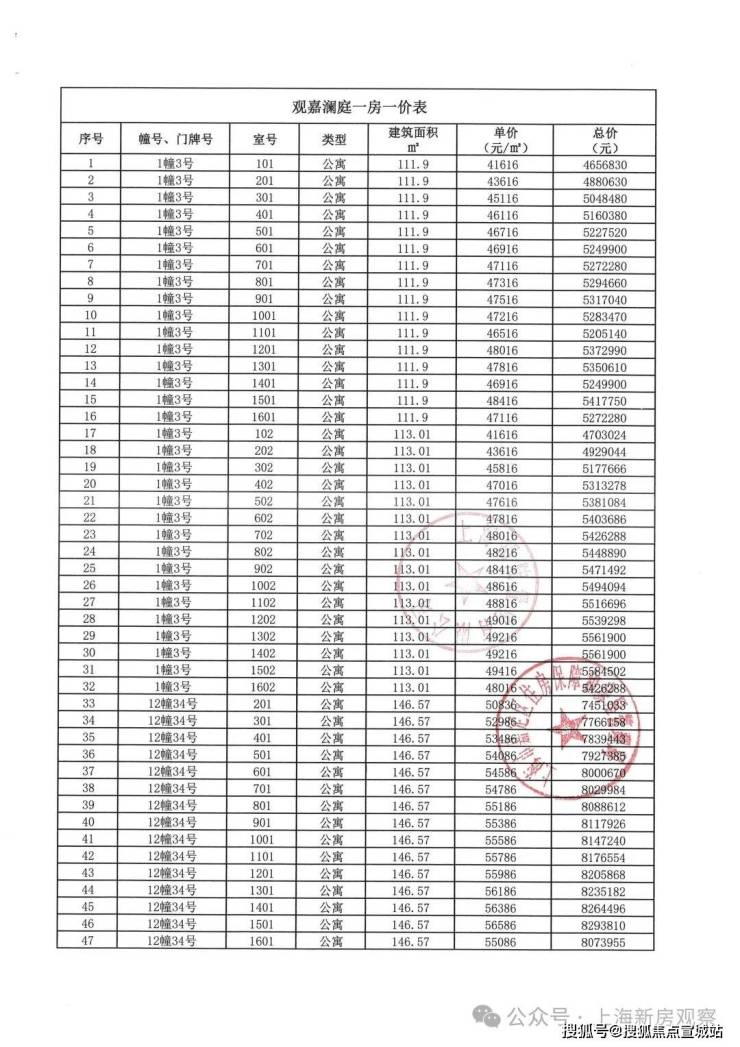 上期一房一价表如下: