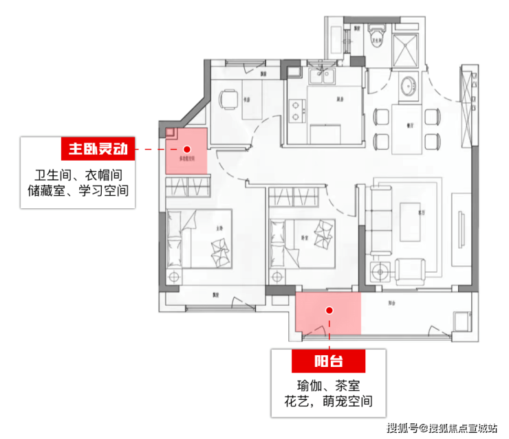 89㎡3房2厅2卫户型,一般只能做1卫,但项目在主卧设计了一个“+1灵动空间”,你可以像样板房把它打造成卫生间,项目预留了排水管。也可以做成衣帽间、梳妆台、储藏间,或者学习空间。