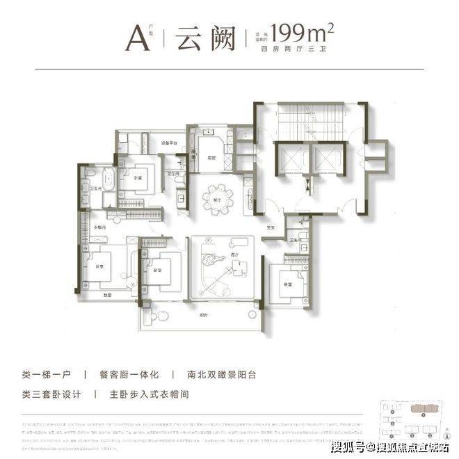 高层均为建面约199㎡的大平层户型,极致纯粹的业主圈层,带来更为尊贵的居住体验。其户型设计尽可能扩宽南向开间的同时,展现出了极为阔绰的空间尺度,足以满足多代同堂的居住需求,成为众多购房家庭终极改善的首选。
