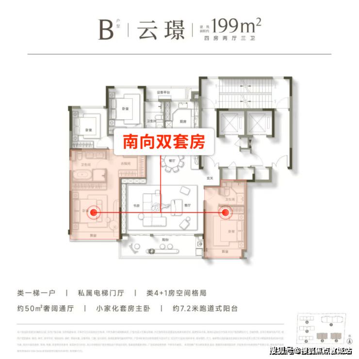 高层户型就两套199平,得房率都不高在85%左右,不过四开间朝南的199户型有设备间“偷面积”,并且算是南北双阳台,个人感觉这个户型更优;