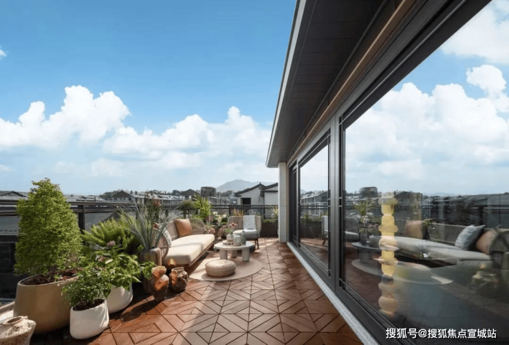 而溪映听庐的上叠,也有空间非常阔绰的阳台+露台,清晨站在露台上,直面群山的翠绿和4000个/立方米的负氧离子。