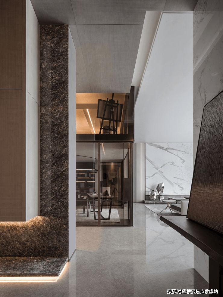 大片深棕色落地玻璃,使整体宛如生长在室内的建造物,结构强烈,与空间有机结合。