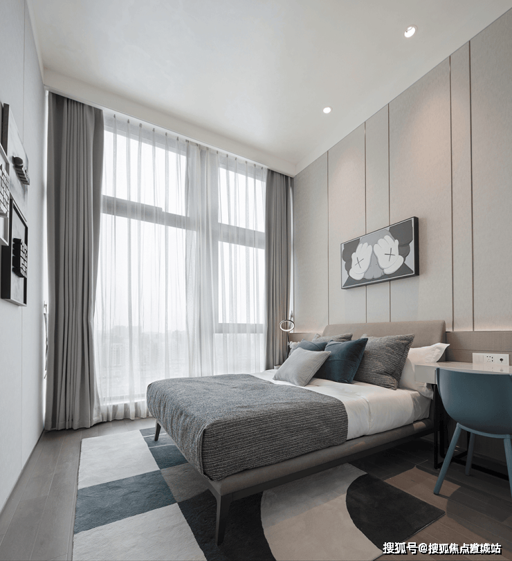 儿童房与主卧一墙之隔,蓝灰色调含蓄温和,简洁的布局使人舒适自在。