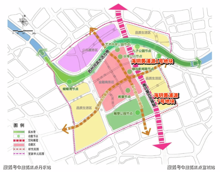 而为了承载这些高端产业,区域集中设置顶级品质商务楼宇,形成高低错落、疏密有致的建筑空间格局和新旧呼应的风貌特质。②规模能级:被苏州河贯穿,规模高达约80公顷的滨水城市更新!