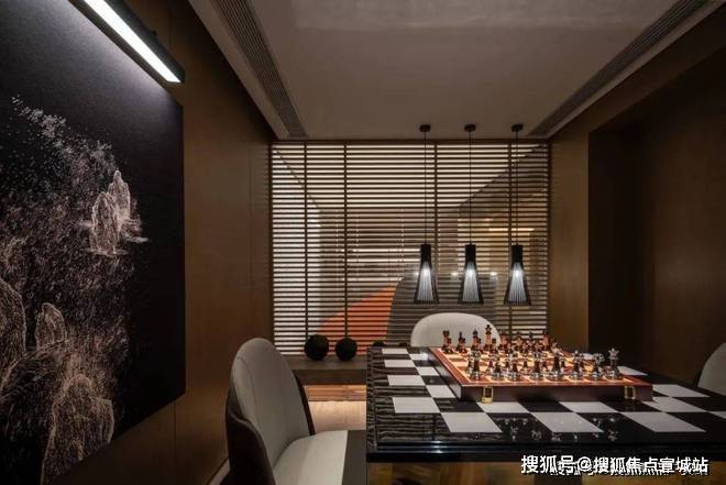 在空间设计中,景观相互映衬,各个区域的形态都是空间格局相互作用的精妙结果.在确保居住私密性的基础上,设计师注重设计的渗透力,巧妙运用百叶窗、镂空隔断等元素,使各个空间在视觉上相互穿透、层次叠加,以独特的设计手法营造出一种家的“大一统”氛围,既保证了空间的独立性,又增强了整体的连贯性.