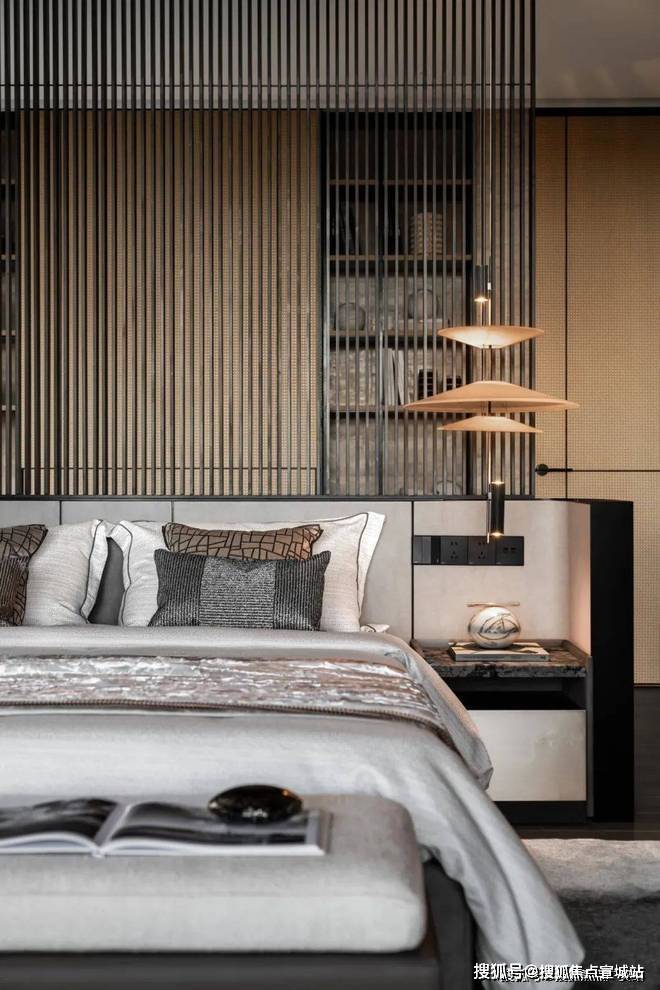 次卧的色调相对更为深邃,设计师通过不同的色彩选择,为静谧的氛围赋予了别样的诠释.有的空间明亮温暖,有的则内敛深沉,各种高品质材料相互搭配,编织出柔软而舒适的触感,再辅以恰到好处的艺术装饰,将空间的高级感提升到新的高度.