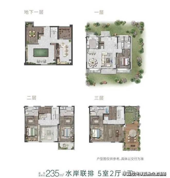 项目推出最后66套建面约205/235㎡实景联排,整体地上三层+庭前绿地+地下室的空间结构.