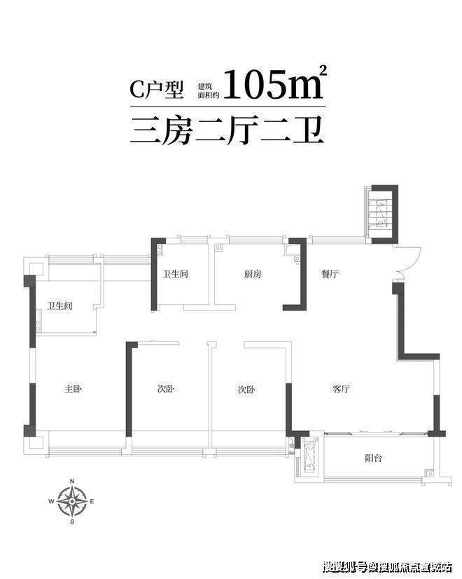建筑面积约105㎡宽厅三房两卫,四开间朝南,舒适栖居理想