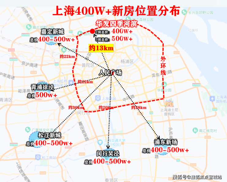 总价在400-500w的新房,大都集中在外环、郊环,板块距离市区的距离平均则在22km以上。嘉定、青浦、松江、闵行、浦东各区总价400w+的新房,都在外环线外,甚至郊环线外!