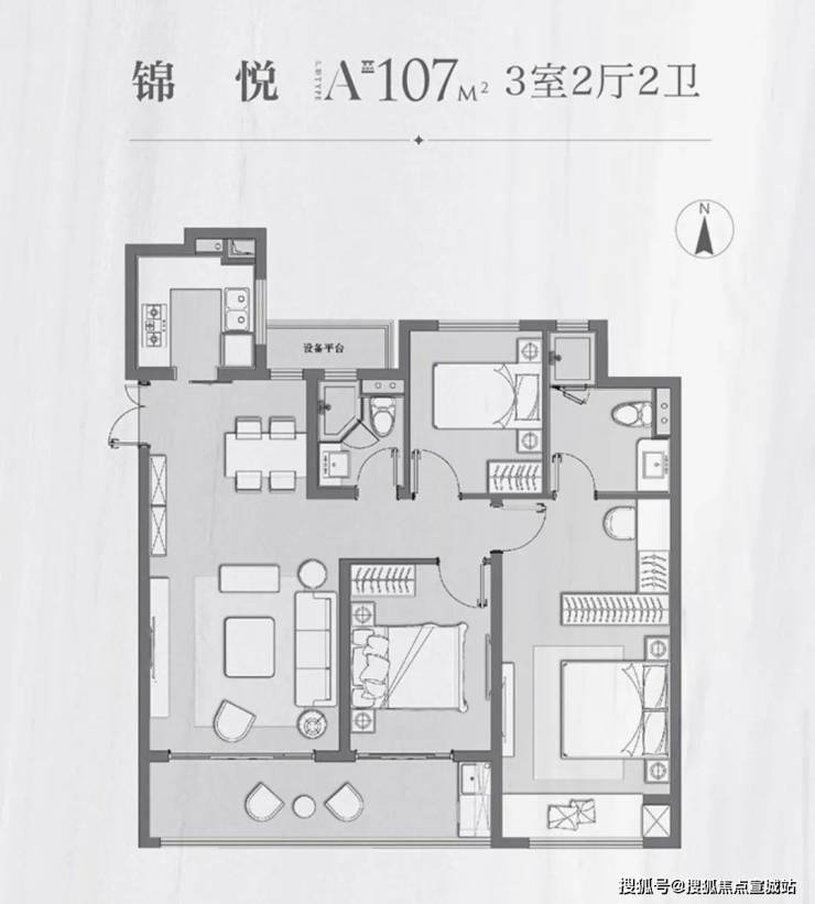 建面约107㎡【锦悦】三室两厅两卫户型设计:三开间朝南格局方正;约6.5米罕有双联阳台尺度奢阔;客餐厅一体化延展家的空间想象;尊贵主卧套房配备独立卫浴、衣帽间、飘窗,彰显主人优雅气度。
