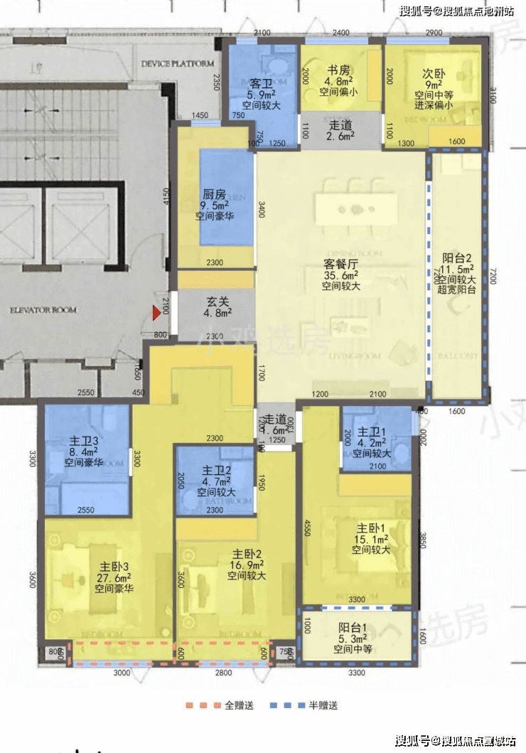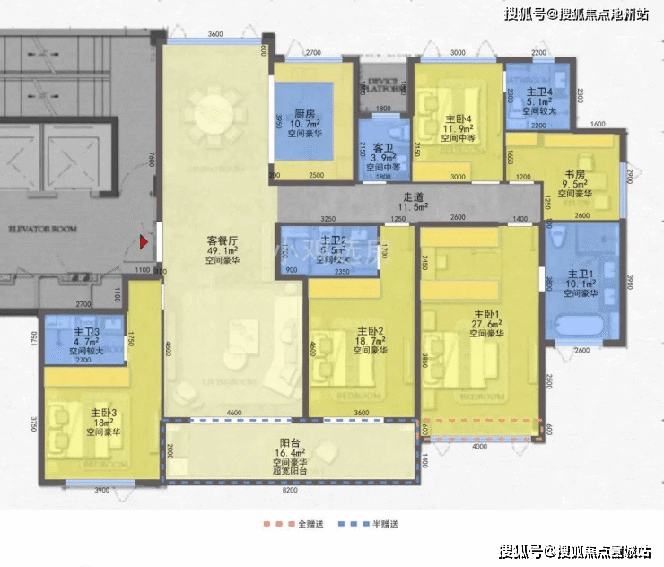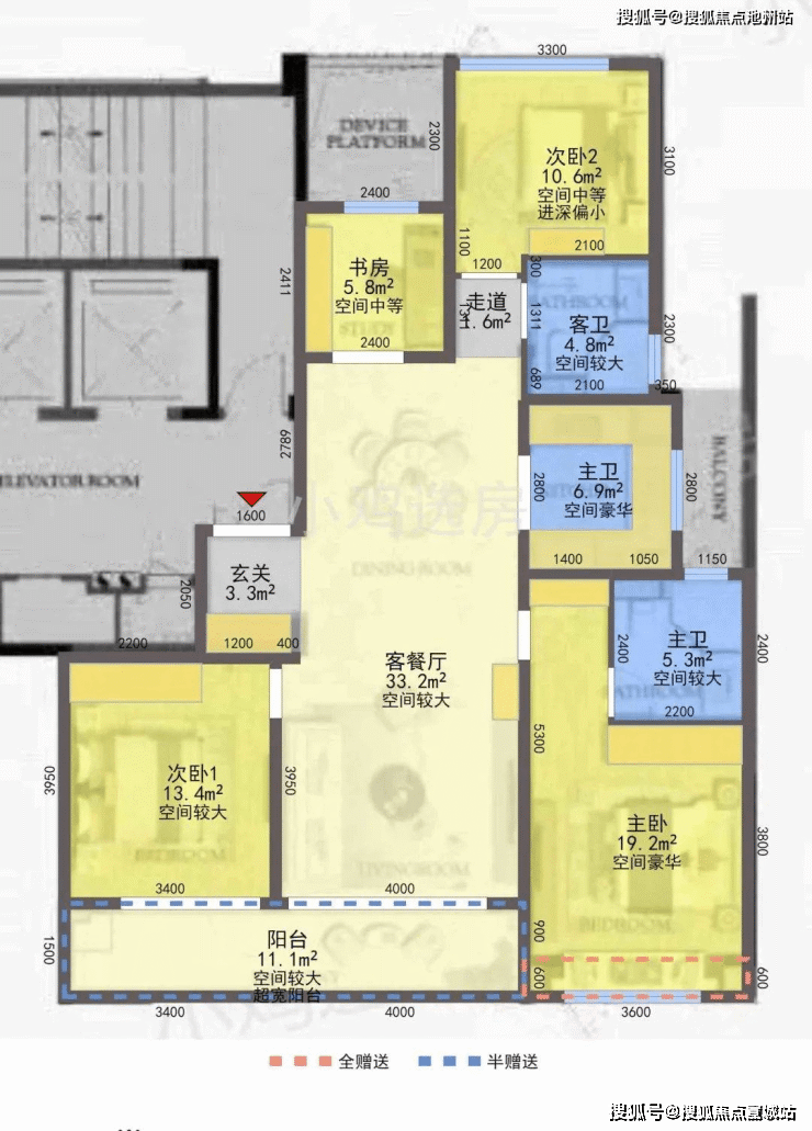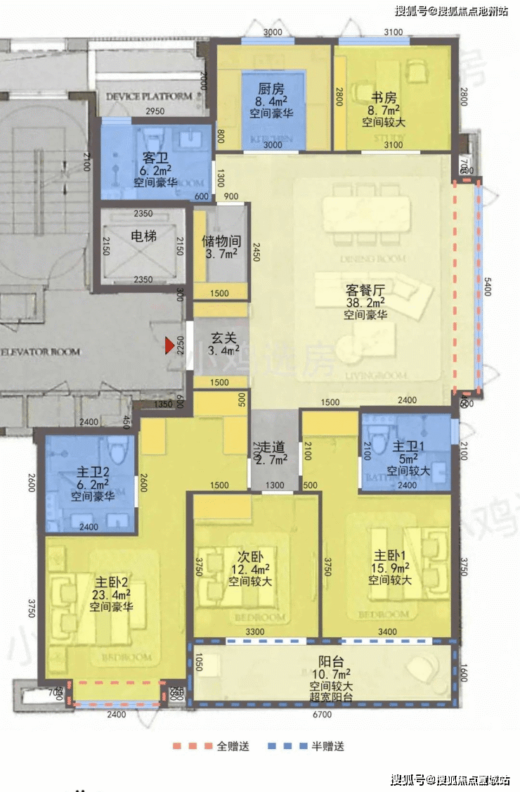 四室两厅三卫户型,含赠送得房率约为88%,不含赠送得房率约为82%。
