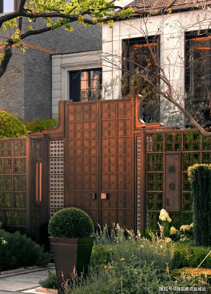 组团入口设置高景墙,运用传统漏窗“框景”手法过滤外部视线;入户门窗错开,进一步加强了私密感,营造出“庭院深深深几许”的大隐隐于市的氛围。