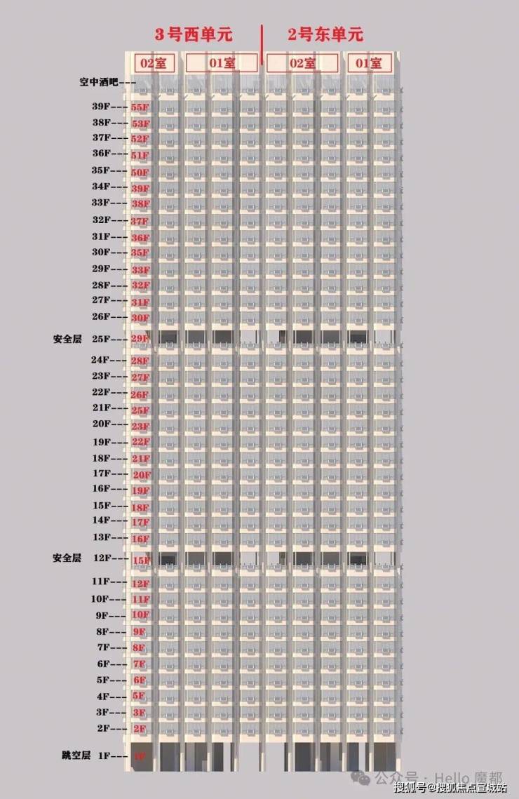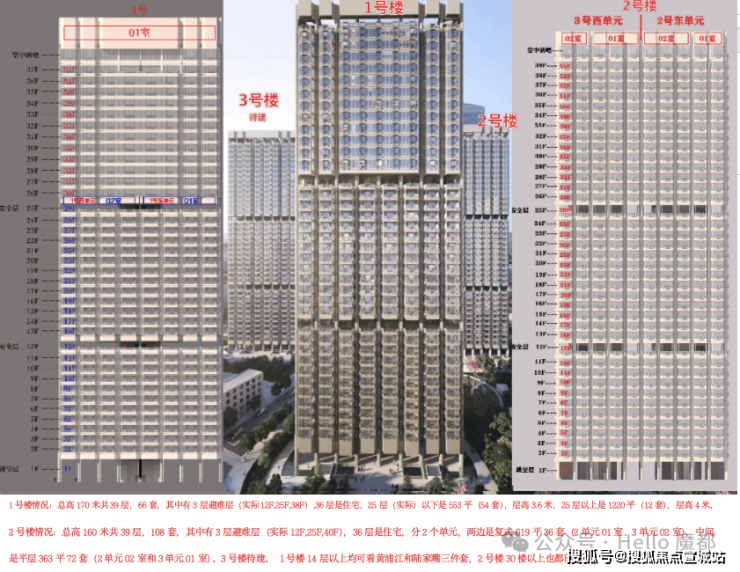 2号楼情况:总高160米共39层,108套,其中有3层避难层(实际12F,25F,40F),36层是住宅,分2个单元,两边是复式619平36套(2单元01室、3单元02室),中间是平层363平72套(2单元02室和3单元01室)。3号楼待建。1号楼14层以上均可看黄浦江和陆家嘴三件套,2号楼30楼以上也都能看到。
