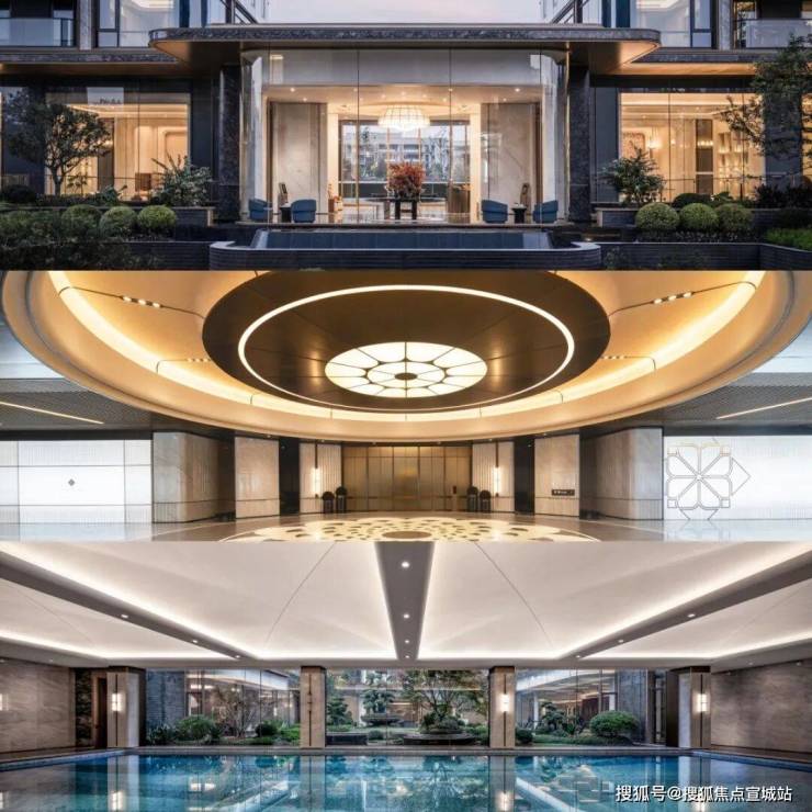 臻选景泰蓝(水吧台),东方白(大堂吧等),山水画(恒温泳池)等,以奢石营造“金玉满堂”质感