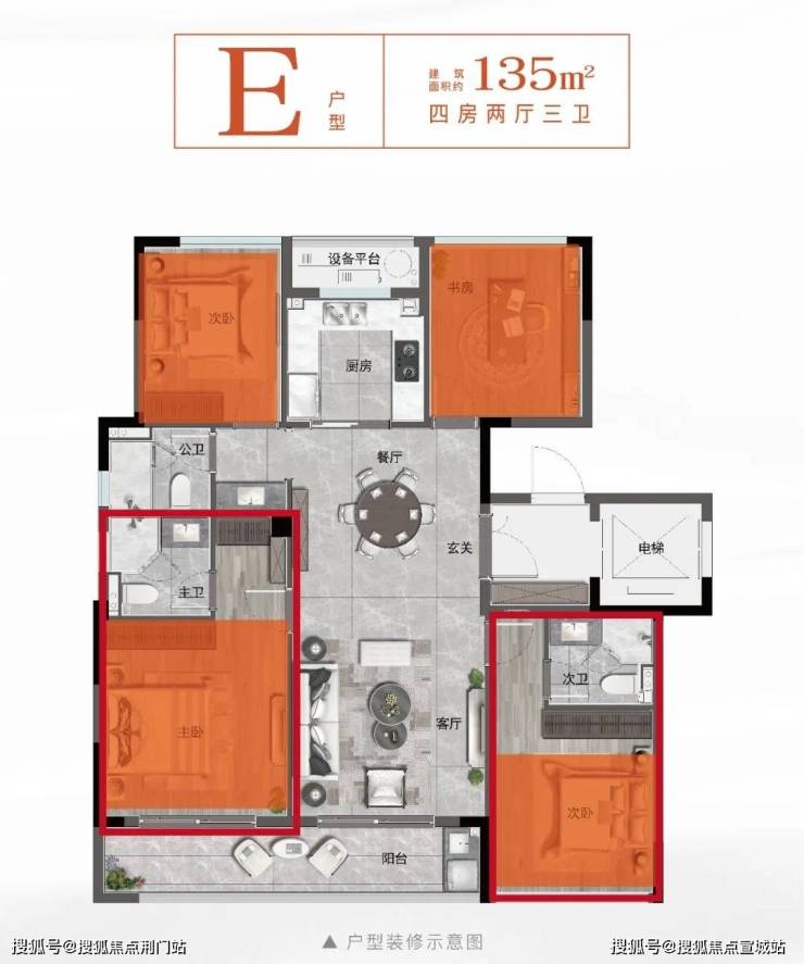 约135㎡户型点评:独立门厅:独立电梯前厅连接独立玄关入户尽显归家礼仪风尚,经典四叶草:奢阔大四房,分散式布局,私密有度彰大宅气度,尊崇双套房:南向卧皆配独立卫浴,同面积段产品,板块祗此,迭代三卫:创领超配设计,隐私主卫,体面客卫,定义富春新改善,环幕通透:三面采光,方正格局,约7.5m巨幕阳台盛载阳光