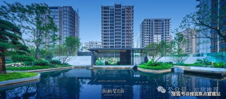 潮映望月府8幢16-26层的高层,采用围合式排布,形成一个内向型的中央主题景观,面积达到约5000方,整体以“一廊三心九园”的规划理念出发,其中的“一园”曲桥风荷,灵感来源于杭州西湖十景之一的曲院风荷,近水平台与中央景观相连,不规则的边界更像是蔚蓝梦幻岛,搭配下沉式休息区,将景观与功能空间巧妙结合。