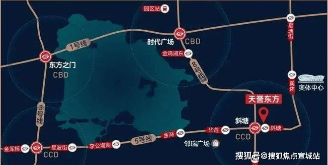 双轨交汇黄金四角环湖四轨交汇,缔造金鸡湖黄金四角,西北-东方之门、东北-时代广场、西南-李公堤、东南斜塘老街一黄金四角所在核芯价值所向.