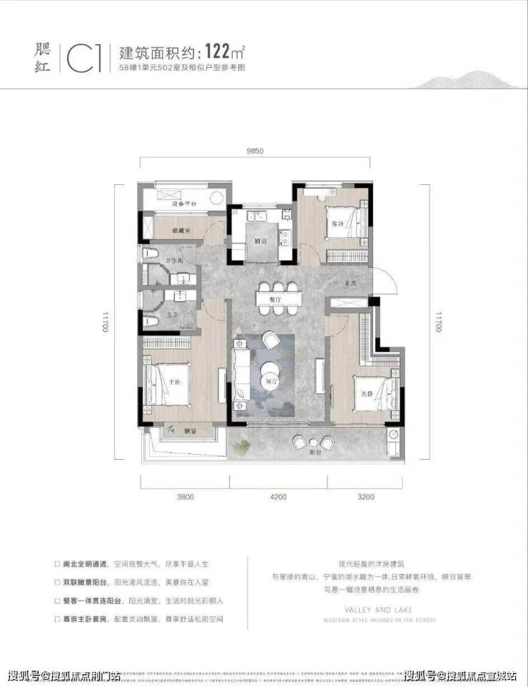 户型点评优势:122㎡的三房两厅两卫设计,留出了独立的玄关收纳空间与落尘区,十分贴心.三个房间分布在三个方向,空间都不显局促,主卧更是自成一体.客厅连阳台,一动一静之间景观尽收眼底.
