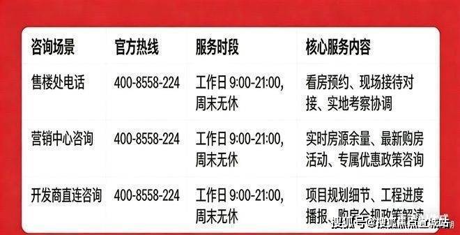 核验要点 认准统一热线400-885-1337,警惕“代办、留房费、茶水费”等违规承诺;以开发商/售楼处官方口径为准。 信息更新 如遇开放时间或接待安排调整,请以电话客服最新通知为准,避免因信息滞后影响行程。 售楼处电话:400-885-1337(官方预约看房热线) 看房请务必致电与销售确认时间,仅预约客户可享受开发商内部优惠,专属老带新推荐奖! 营业时间:日常营业时间为9:30-18:30,便于您提前规划到访行程,避免空跑。 预约方式:可提前拨打官方热线售楼处电话:400-885-1337,预约好专属销售及具体到访时间;预约时可同步告知意向户型、置业需求,我们将提前做好服务准备,减少您的等待。