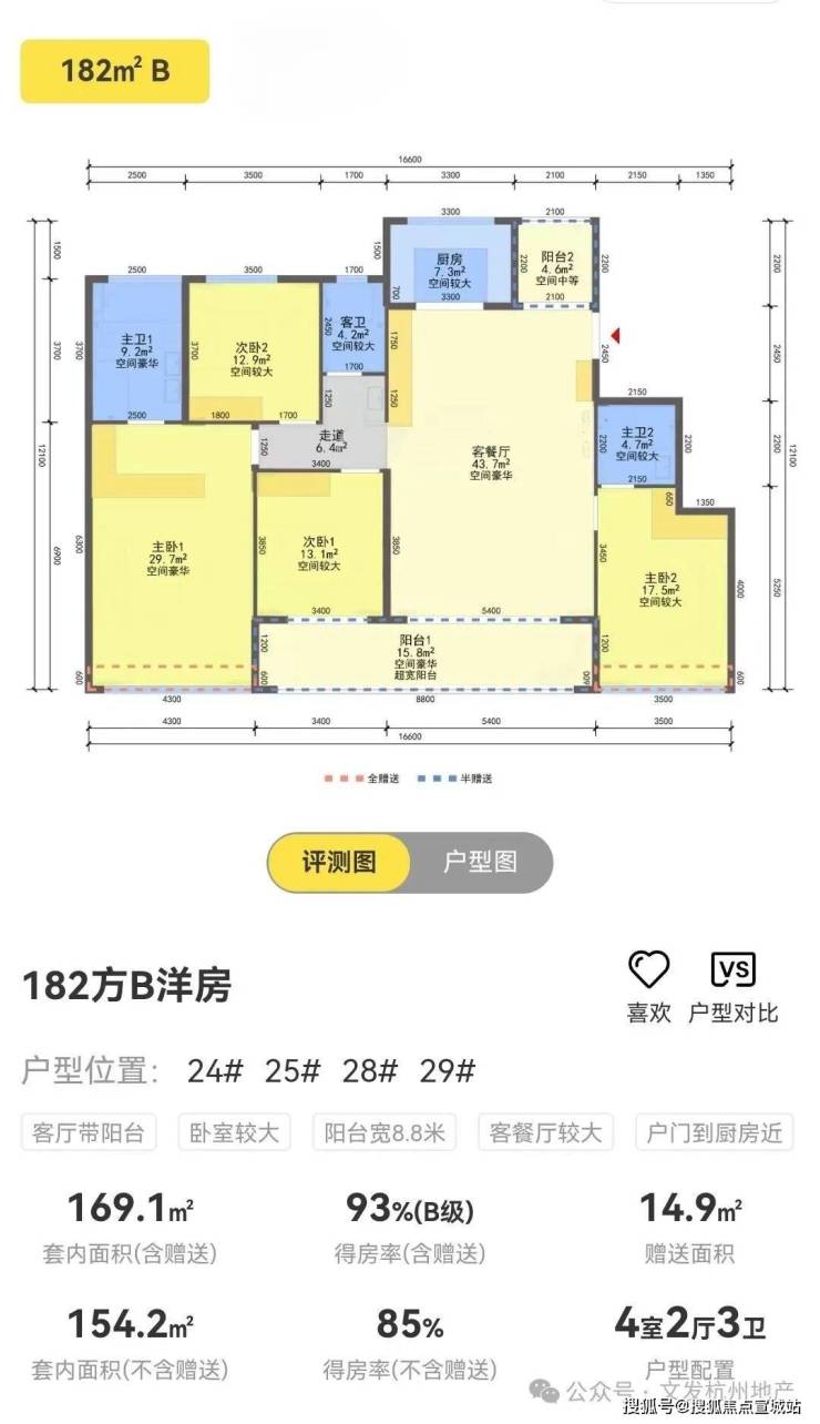 得房率:166㎡含赠送得房率95%,182㎡含赠送得房率93%