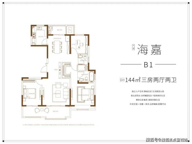 目前开盘的1号楼均为144㎡户型,只做了3房2厅2卫,超大的双联阳台,尺度感拉满。