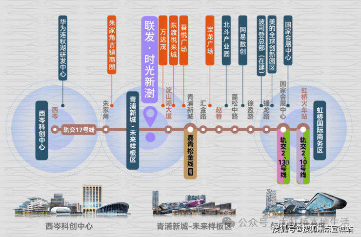 项目直线距离800米的17号线淀山湖大道站,坐落商业建面约43万㎡的青浦万达茂、东渡悦来城两大站前超级商业,再往东还有吾悦广场。