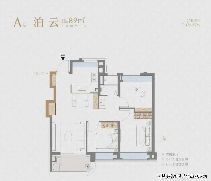 建面约89㎡3房户型,利用科学的收纳和S墙设计保障了室内空间的井井有条,又通过大量飘窗和阳台等提升尺度感,厨房也附带飘窗。