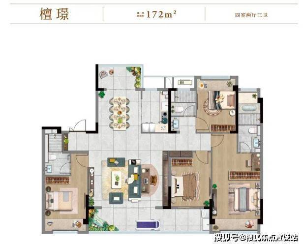主力户型:建面约 143㎡四房两厅两卫、172㎡四房两厅三卫、196㎡四房两厅三卫。