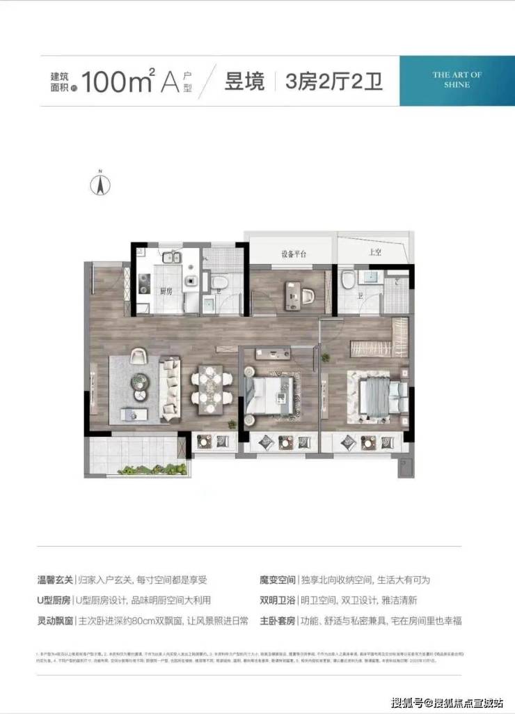 3、建筑面积约100/110/125㎡精奢宽境超能户型:户型设计、精装品牌、人居系统等多维领域都超越以往,大横厅、宽幕阳台、高得房率、高附赠等。