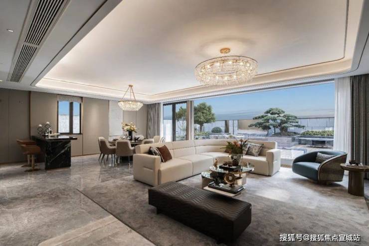 在空间设计上,南向大开间的打造更是独具匠心,平均窗墙比在45%左右。其中首层餐客厅大手笔打造约7米的“IMAX宽屏”落地窗,将窗墙比提升至80%以上,巧妙地融合了自然景致与室内空间。