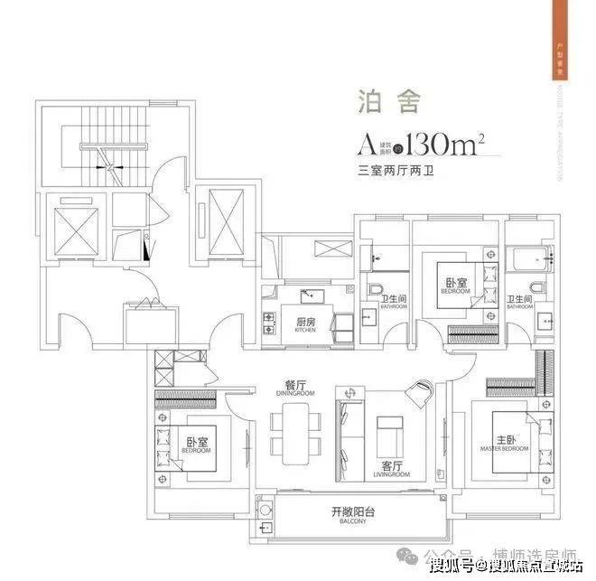 130户型是2梯2户设计,做的大三房。入户玄关储藏空间比较大,收纳充足。三开间朝南,朝南面宽13.2米,大横厅与阳台直接相连,开间6.4米。