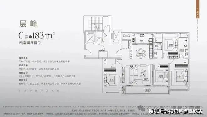 183户型为2梯2户设计,做了4房2厅3卫,含2个套房。户型方正,没有空间浪费;四开间朝南,南向面宽达16.3米,客厅开间6米,阳台宽9米;入户有玄关,预留了家政间空间;餐厨区南北向连,与客厅保持恰当的距离;主卧套房面积约32.6㎡,卫生间含双台盆、淋浴和浴缸;次卧套房面积也不小,但是为暗卫。