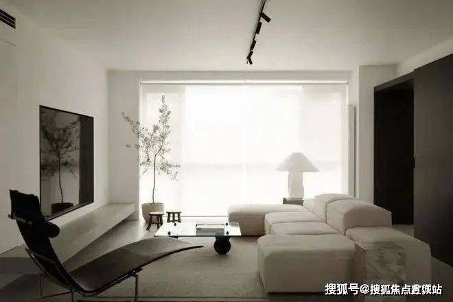 四白落地的墙面,浅灰色混凝土地坪和无主灯设计,让空间更加简洁干净的同时,也为屋主希望‘家’和‘画廊’空间的结合成为可能。