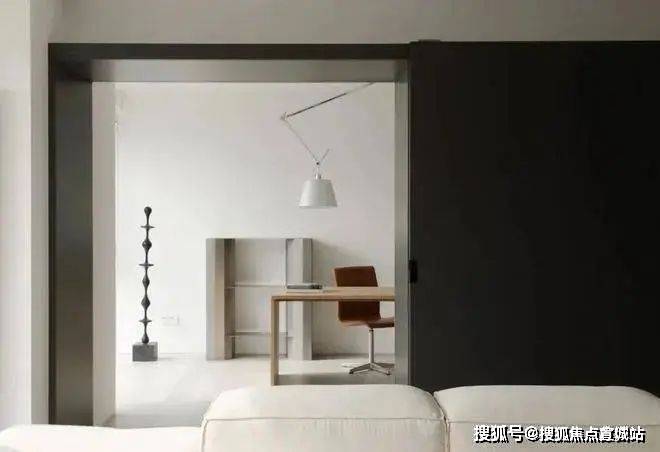 客厅沙发背后的深灰色烤漆书墙背后是书房的所在,以一扇2m长的深灰色烤漆移门控制开合,形成,形成“1+1”的可变空间组合,既满足了收纳需求,又实现了社交空间与私人空间的转换。