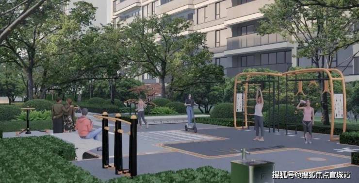 周边配置独立成环的跑道、康体健身设施以及休闲阳光草坪,满足照看成年人的运动和休憩需求.阳光倾撒之下,老中幼青各得其乐.