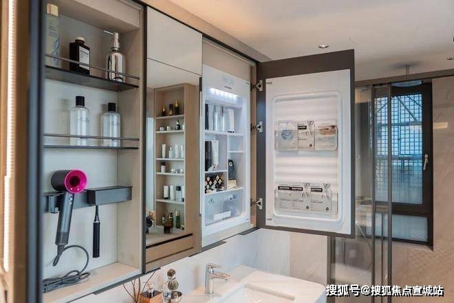 比如说,卫生间的镜柜设计,内设三宫格镜柜收纳: