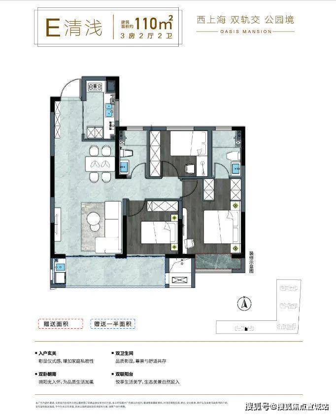 :如105平方米、110平方米的3室2厅2卫户型,空间宽敞,功能分区明确,适合三代同堂或多口之家居住。