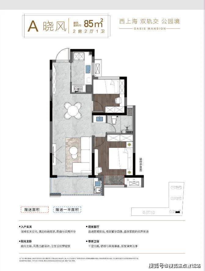 :如85平方米的2室2厅1卫户型,适合小家庭或年轻夫妇居住。