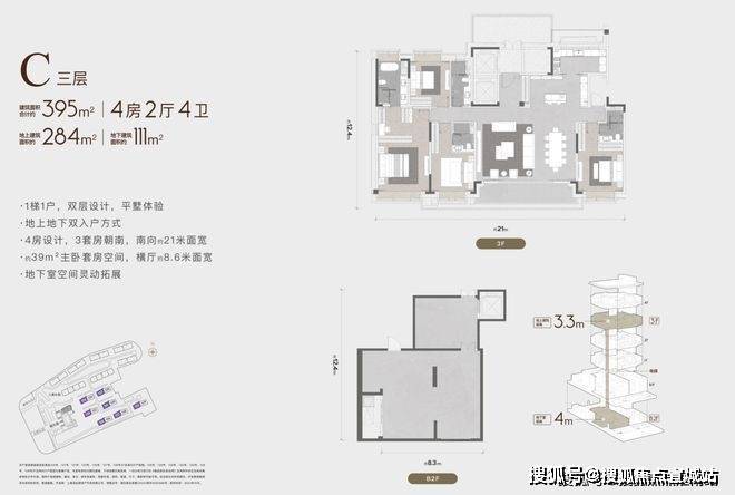 以C户型这套四楼的户型为例,整个开间尺度达到21米,客厅面宽达到了8.6米,这个尺寸不仅是一般的大平层,应该说即使是联排别墅或者风貌别墅产品里很难看到这个面宽,是独栋别墅级的面宽.建筑面积合计约403㎡4房2厅4卫