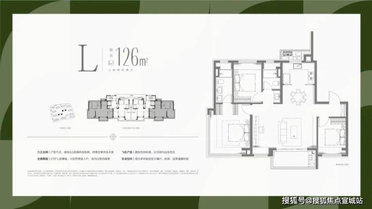 建筑面积约126平方米户型,实现了大面宽横厅的飞机户型设计,使得南向的开间,全部布置为客厅、主卧和次卧三个最重要的功能区;北向房间则布置了次要的厨房、次卫、书房和主卫功能,最优化的提供南向面宽和缩窄户型整体进深,提升户型整体的采光和通风。